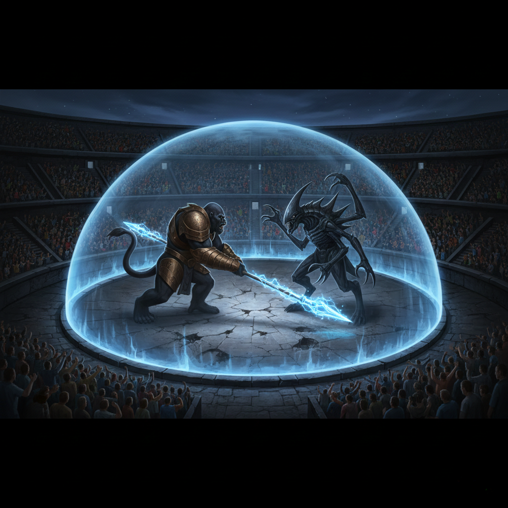 المدرّج كان مرسوماً على شكل دائرة كاملة، وفي الوسط توجد ساحة كبيرة، ساحة يتقاتل فيها وحشان ضخمان، كل واحد بطول يقارب العشرة أمتار… أحدهما يبدو كغوريلا بلا شعر، وله ذيل سميك، يمسك بعصا طويلة مضيئة ويرتدي دروعاً سميكة، أمّا الآخر فكان يبدو كنوع من الوحوش الحشرية، لديه رأس مدبّب من الخلف، وسلاحه عبارة عن مخالب طويلة تخرج من رسغه.