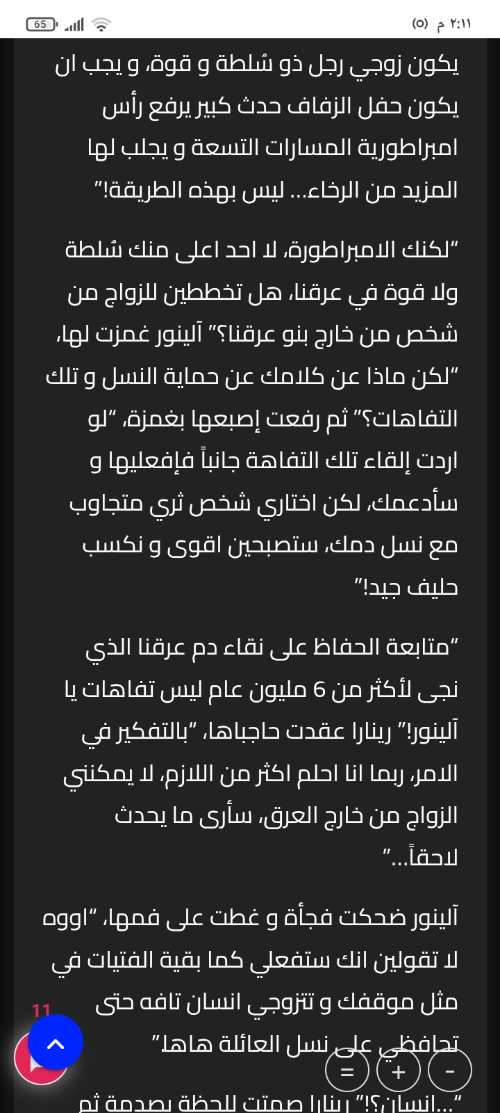 “لكنك الامبراطورة، لا احد اعلى منك سُلطة ولا قوة في عرقنا، هل تخططين للزواج من شخص من خارج بنو عرقنا؟” آلينور غمزت لها، “لكن ماذا عن كلامك عن حماية النسل و تلك التفاهات؟” ثم رفعت إصبعها بغمزة، “لو اردت إلقاء تلك التفاهة جانباً فإفعليها و سأدعمك، لكن اختاري شخص ثري متجاوب مع نسل دمك، ستصبحين اقوى و نكسب حليف جيد!”