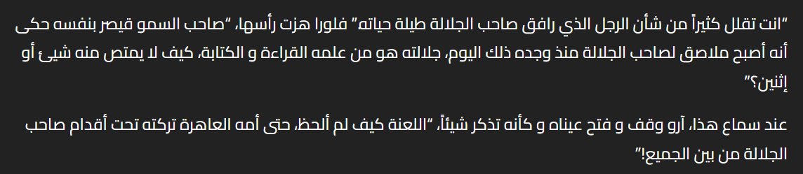 “انت تقلل كثيراً من شأن الرجل الذي رافق صاحب الجلالة طيلة حياته.” فلورا هزت رأسها، “صاحب السمو قيصر بنفسه حكى أنه أصبح ملاصق لصاحب الجلالة منذ وجده ذلك اليوم، جلالته هو من علمه القراءة و الكتابة، كيف لا يمتص منه شيئ أو إثنين؟”