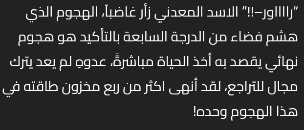 “رااااور–!!” الاسد المعدني زأر غاضباً، الهجوم الذي هشم فضاء من الدرجة السابعة بالتأكيد هو هجوم نهائي يقصد به أخذ الحياة مباشرةً، عدوهِ لم يعد يترك مجال للتراجع، لقد أنهى اكثر من ربع مخزون طاقته في هذا الهجوم وحده!