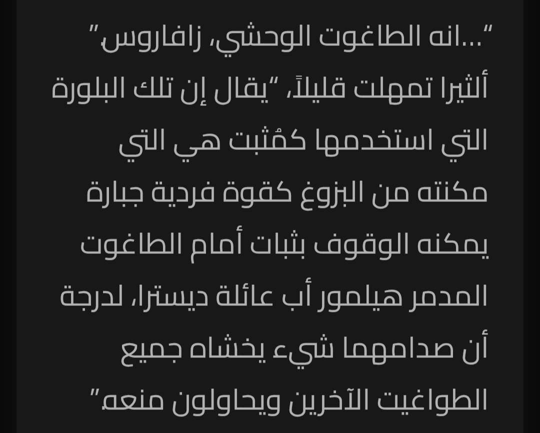 “…انه الطاغوت الوحشي، زافاروس.” ألثيرا تمهلت قليلاً، “يقال إن تلك البلورة التي استخدمها كمُثبت هي التي مكنته من البزوغ كقوة فردية جبارة يمكنه الوقوف بثبات أمام الطاغوت المدمر هيلمور أب عائلة ديسترا، لدرجة أن صدامهما شيء يخشاه جميع الطواغيت الآخرين ويحاولون منعه.”