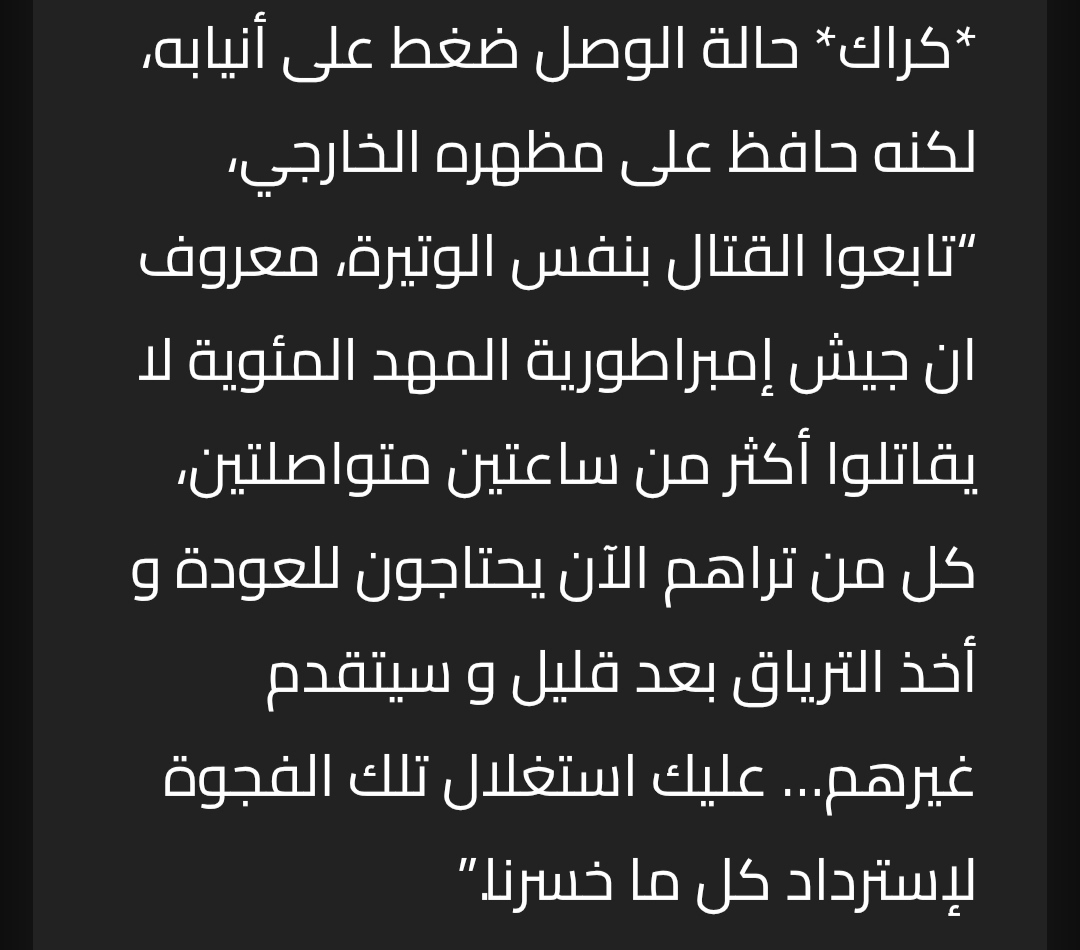 *كراك* حالة الوصل ضغط على أنيابه، لكنه حافظ على مظهره الخارجي، “تابعوا القتال بنفس الوتيرة، معروف ان جيش إمبراطورية المهد المئوية لا يقاتلوا أكثر من ساعتين متواصلتين، كل من تراهم الآن يحتاجون للعودة و أخذ الترياق بعد قليل و سيتقدم غيرهم… عليك استغلال تلك الفجوة لإسترداد كل ما خسرنا.”