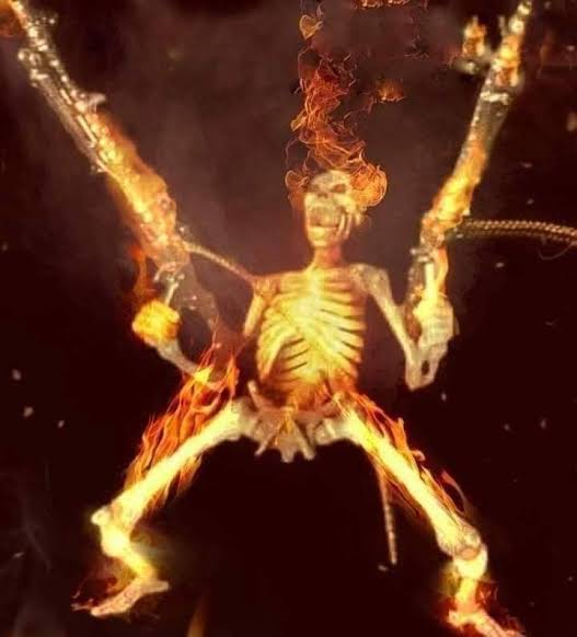 “….؟!” الجينرال نظر للأسفل ببطئ، هنالك رأى بيلي يحمل كتلة من النار على إصبعه السبابة، ثم أطلقها نحوه ببطئ شديد.