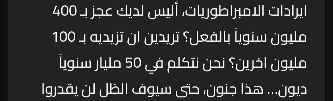 “…..” و فعلاً كرستان استغرب و إلتفت نحو إيميلي، *يا فتاة، لقد ألقيت نظرة على مصروفات و ايرادات الامبراطوريات، أليس لديك عجز بـ 400 مليون سنوياً بالفعل؟ تريدين ان تزيديه بـ 100 مليون اخرين؟ نحن نتكلم في 500 مليون سنوياً ديون… هذا جنون، حتى سيوف الظل لن يقدروا على سداد كل هذا، خالي لم يرسل لهم اي شئ منذ 50 عام، قد نضطر لبيع السلاح في النهاية!*