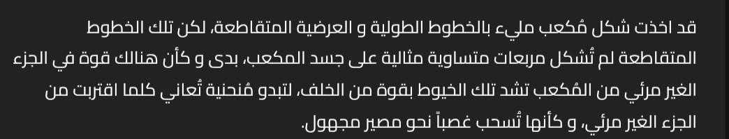 قد اخذت شكل مُكعب مليء بالخطوط الطولية و العرضية المتقاطعة، لكن تلك الخطوط المتقاطعة لم تُشكل مربعات متساوية مثالية على جسد المكعب، بدى و كأن هنالك قوة في الجزء الغير مرئي من المُكعب تشد تلك الخيوط بقوة من الخلف، لتبدو مُنحنية تُعاني كلما اقتربت من الجزء الغير مرئي، و كأنها تُسحب غصباً نحو مصير مجهول.