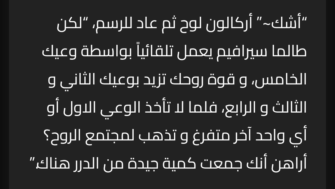 “أشك~” أركالون لوح ثم عاد للرسم، “لكن طالما سيرافيم يعمل تلقائياً بواسطة وعيك الخامس، و قوة روحك تزيد بوعيك الثاني و الثالث و الرابع، فلما لا تأخذ الوعي الاول أو أي واحد آخر متفرغ و تذهب لمجتمع الروح؟ أراهن أنك جمعت كمية جيدة من الدرر هناك.”
