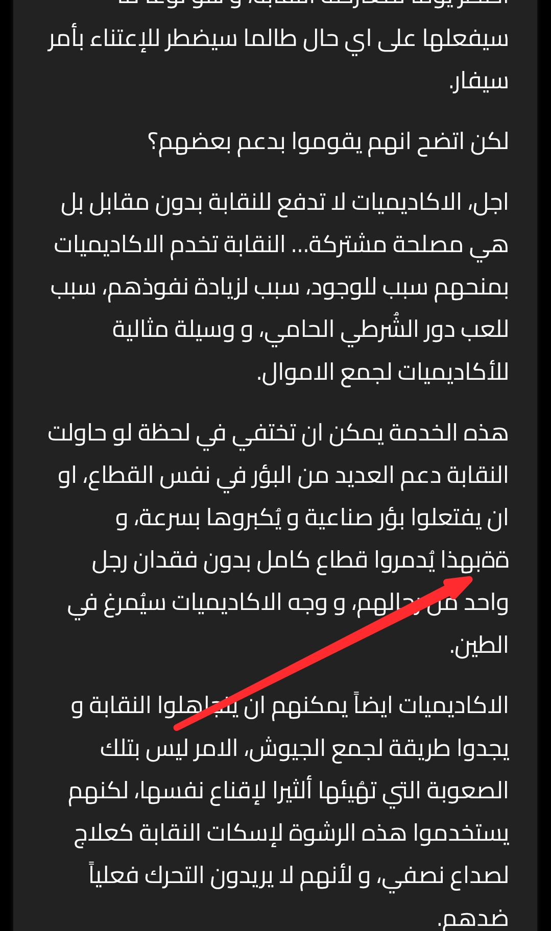 هذه الخدمة يمكن ان تختفي في لحظة لو حاولت النقابة دعم العديد من البؤر في نفس القطاع، او ان يفتعلوا بؤر صناعية و يُكبروها بسرعة، وبهذا يُدمروا قطاع كامل بدون فقدان رجل واحد من رجالهم، و وجه الاكاديميات سيُمرغ في الطين.