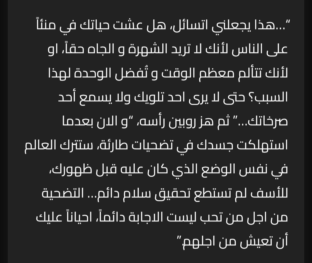“لقد فكرت كثيراً في الاونة الاخيرة، يا روبين الصغير، فكرت كثيراً، لا تحسبني كنت غافل عما يجري…” الشيخ الكون حدق في روبين بعيناه الفارغتان، ثم بدأ يُتمتم، “لقد أفنيت عمري من اجل الكون، و مجرد إشاعة عن وفاتي أعادت الفوضى و جلب السب و الكراهية لإسمي، الجميع يقول هذا يحدث بسبب الشيخ الكوني، المريض، الشيخ الكوني، لم أرَ نصب تذاكري حتى او تجمع دُعاء من العامة او النبلاء.”