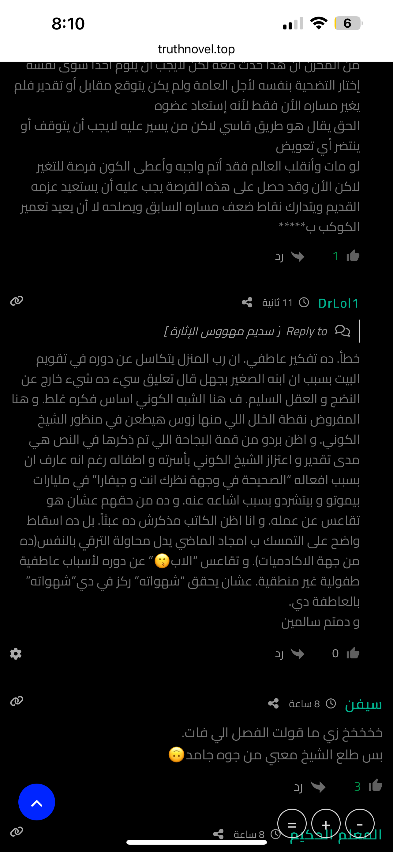 ده تعليقي على المهووس، الاب هنا تشبيه بين رئيس الدولة و الشيخ الكوني، و الاكادميات غلطتهم انهم بيتقاعسو عن بذل محهودهم في انهم يقاومو مضادات الحياة، لما منشن ان وصي مرتفع”الثيرا” تقدر لوحدها تهزم وحش فضاء بالغ منخفض تقريبا او يافع مرتفع لو شد حيله. “بس طبعا عشان كل واحد عايز مصلحته ف انتشر الفساد و الكسل بينهم”. و بالنسبة للشيخ الكوني مس عارف اقرل ايه زيادة. بس هو تفكيره غلط عموما، عشان ابوك مثلا. لو اناو شديتو مع بعض في مرة. هل عادي و طبيعي و مقبول للعقل و المنطق السليم ان هو يقطع معاك بسببها و ميصرفش عليك… قراءة المزيد ..