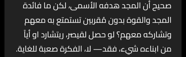 صحيح أن المجد هدفه الأسمى، لكن ما فائدة المجد والقوة بدون مُقربين تستمتع به معهم وتشاركه معهم؟ لو حصل لقيصر، ريتشارد او أياً من ابناءه شيء، فقد— لا، الفكرة صعبة للغاية.