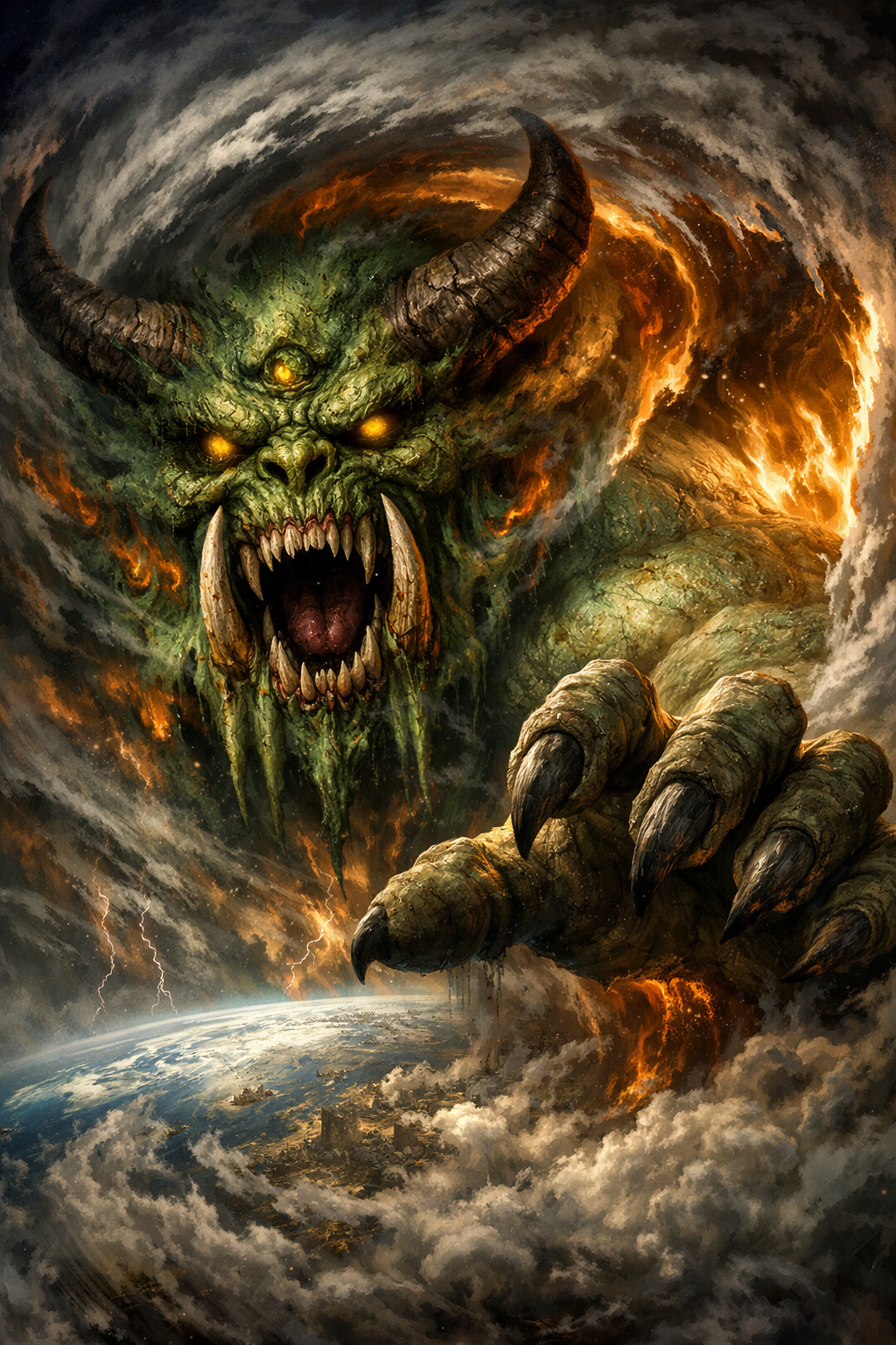 ذلك المخلوق لم يتزحزح من مكانه، لم يظهر اختبار جديد، لكن السماء بدأت تنشقّ مجددًا… سرعان ما ظهرت كتف مليئة بالعضلات، ثم كف ضخم يكفي لتغطية المرج المُحترق بالكامل.