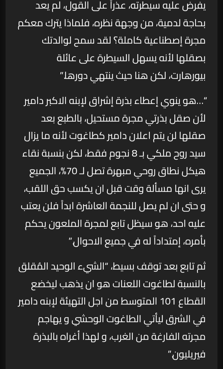 “من بين الجميع، أنتِ من تسألين ذلك السؤال؟” عبس دامير والغضب واضح عليه: “سأجيبكِ؛ بدون هذه المصفوفة سأظل سيد روح ملكي ذا تسعة نجوم فـ لي أساليبي الخاصة.” ثم أشار نحوها: “أما أنتِ، فبدون قانون الترميد الذي تسلمتِه من أبيكِ على طبق من فضة، ماذا تكونين؟”