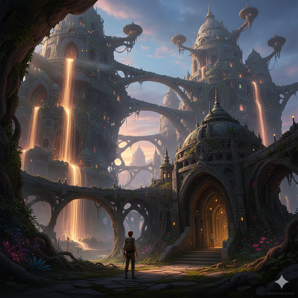 إيقاع عكازي على الحجر حملني عبر شرفات وجسور نمت من صخور حية. لم تكن هذه معجزات بالنسبة لي بعد الآن—بل مجرد جزء من العالم اليوم. وبحلول الوقت الذي وصلت فيه إلى بابي، كان الشفق قد ازداد سطوعاً مرة أخرى، أنهار بطيئة من الضوء تنزلق عبر الجدران.