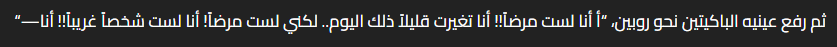 ثم رفع عينيه الباكيتين نحو روبين، “أ أنا لست مرضاً!! أنا تغيرت قليلاً ذلك اليوم.. لكني لست مرضاً! أنا لست شخصاً غريباً!! أنا—“