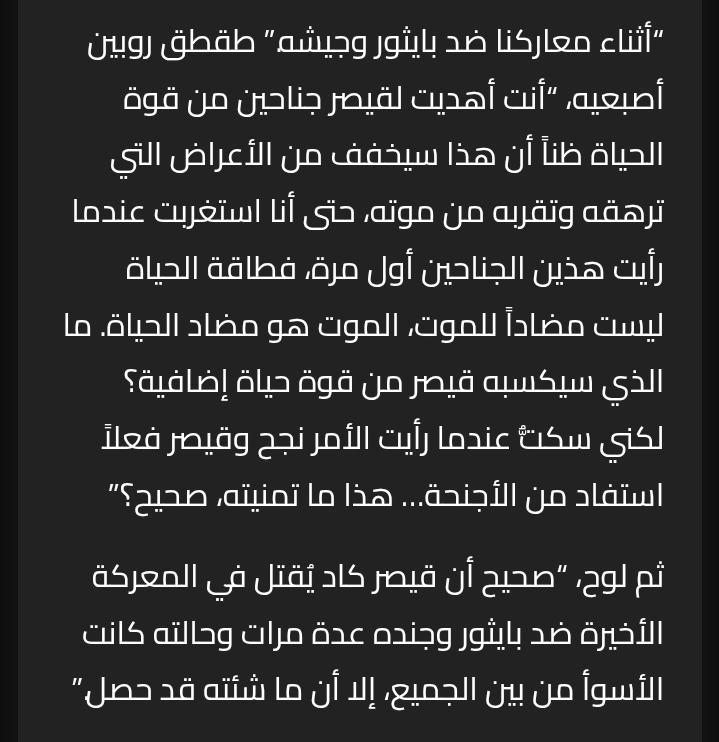 “أثناء معاركنا ضد بايثور وجيشه.” طقطق روبين أصبعيه، “أنت أهديت لقيصر جناحين من قوة الحياة ظناً أن هذا سيخفف من الأعراض التي ترهقه وتقربه من موته، حتى أنا استغربت عندما رأيت هذين الجناحين أول مرة، فطاقة الحياة ليست مضاداً للموت، الموت هو مضاد الحياة. ما الذي سيكسبه قيصر من قوة حياة إضافية؟ لكني سكتُّ عندما رأيت الأمر نجح وقيصر فعلاً استفاد من الأجنحة… هذا ما تمنيته، صحيح؟”
