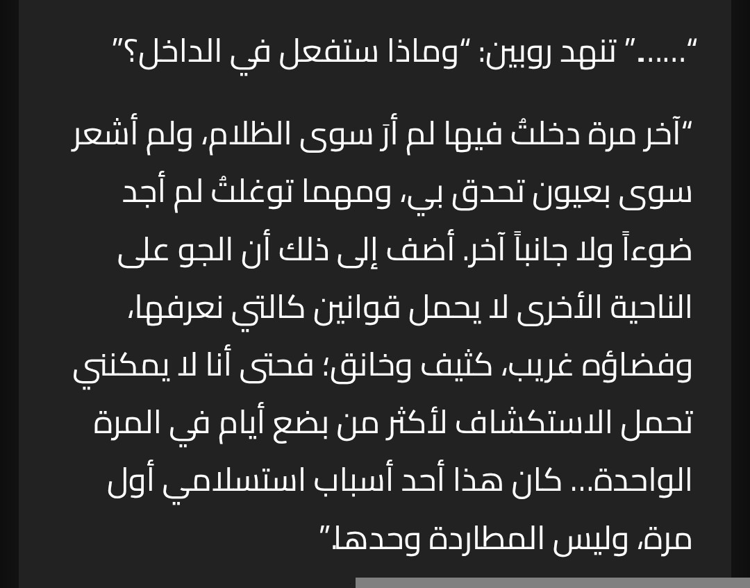 “ما الذي يحدث على الجانب الآخر…” وقف روبين ببطء، وكلتا يديه ما تزالان تكتبان وكل ما يفعله ما يزال جارياً لم يتوقف. مهما كان مقدار الخطر، طالما هذان الاثنان هناك فلا داعي للفزع، إلا بالطبع لو كان وحش فضاء (سلفاً)، عندها سيتحتم عليه إطلاق الشظية بسرعة.
